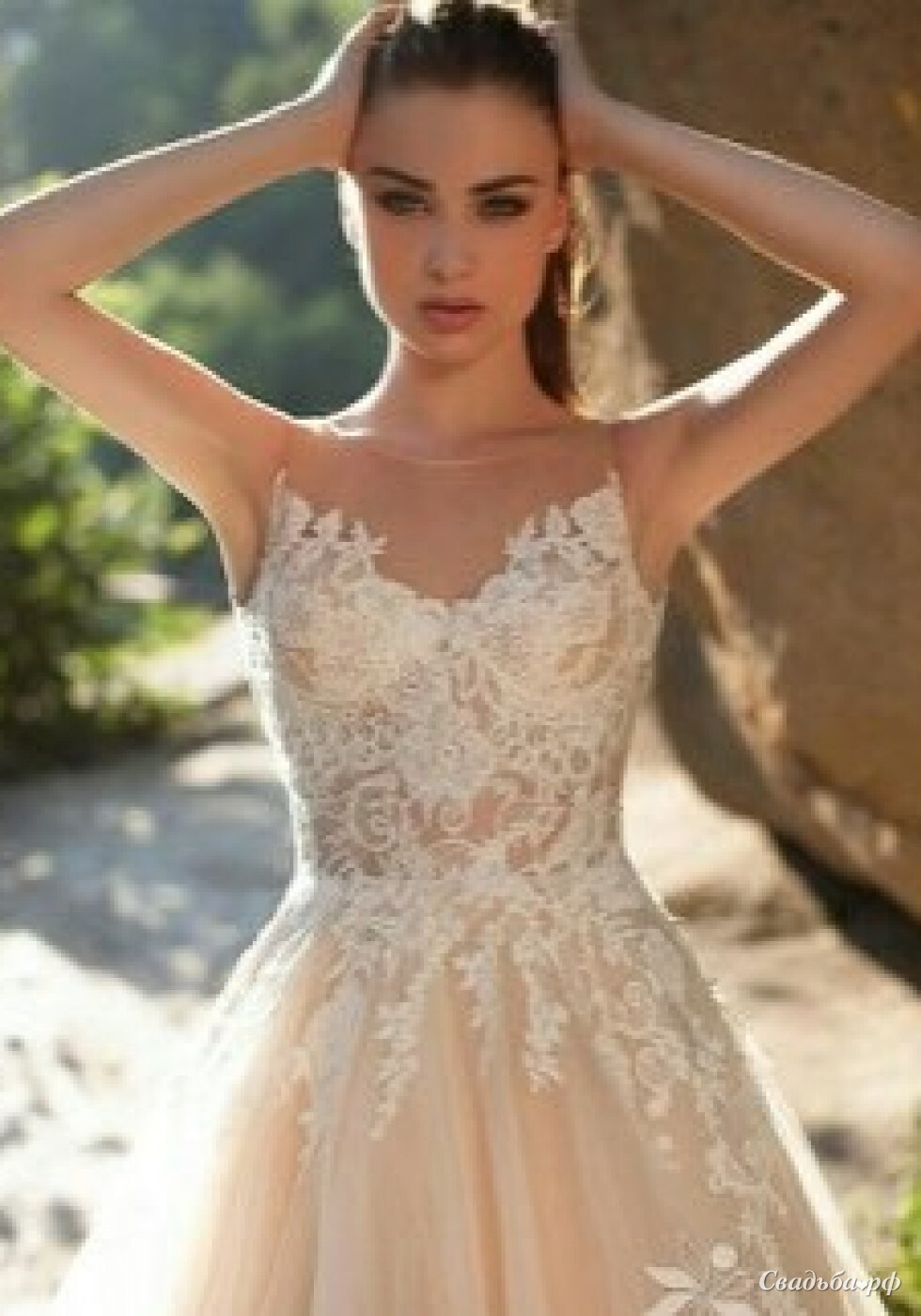Свадебное платье с пышной юбкой цвета пудра, телесный корсет задекорирован кружевом.