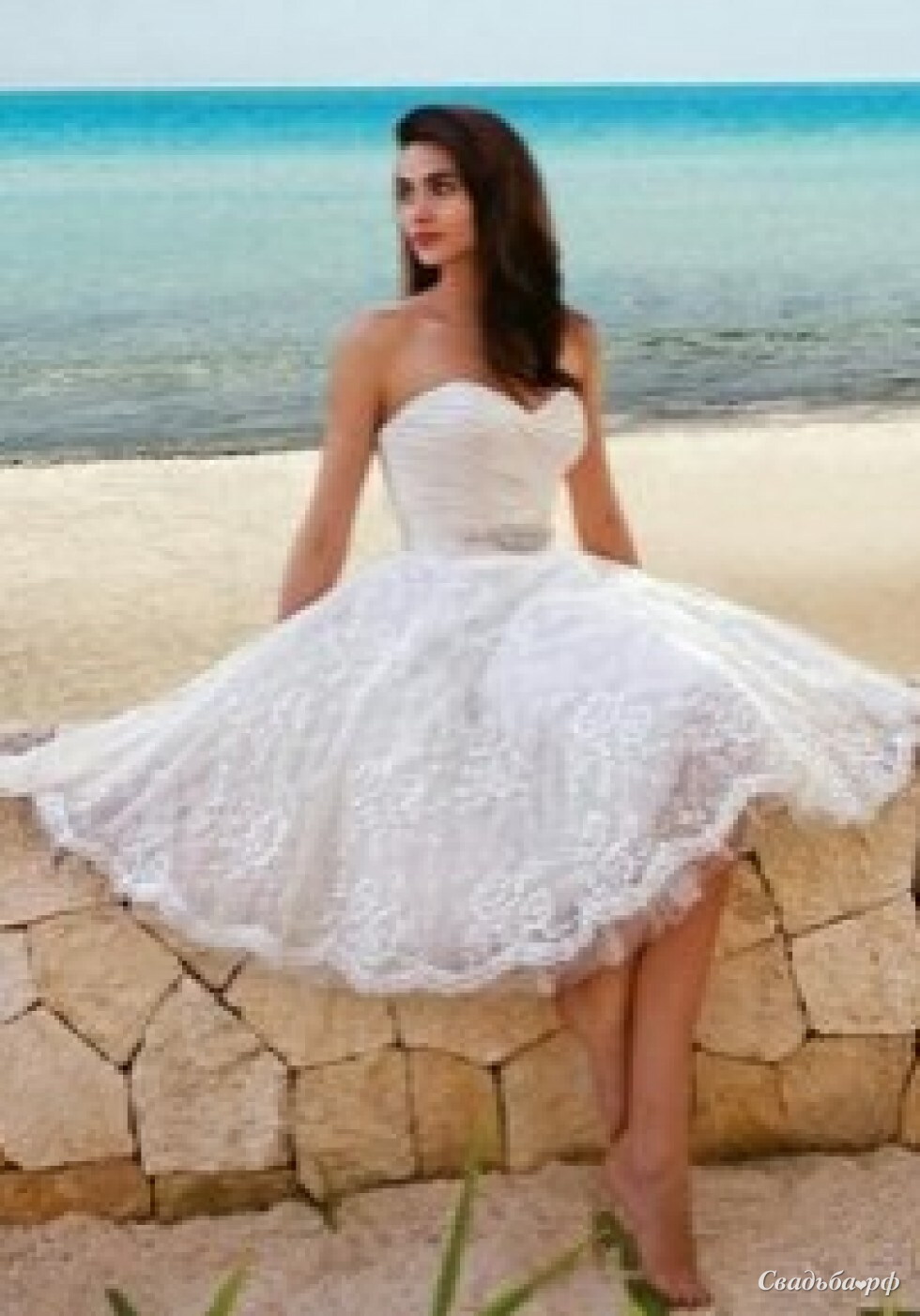 Короткое свадебное платье, открытое декольте и кружевная юбка.