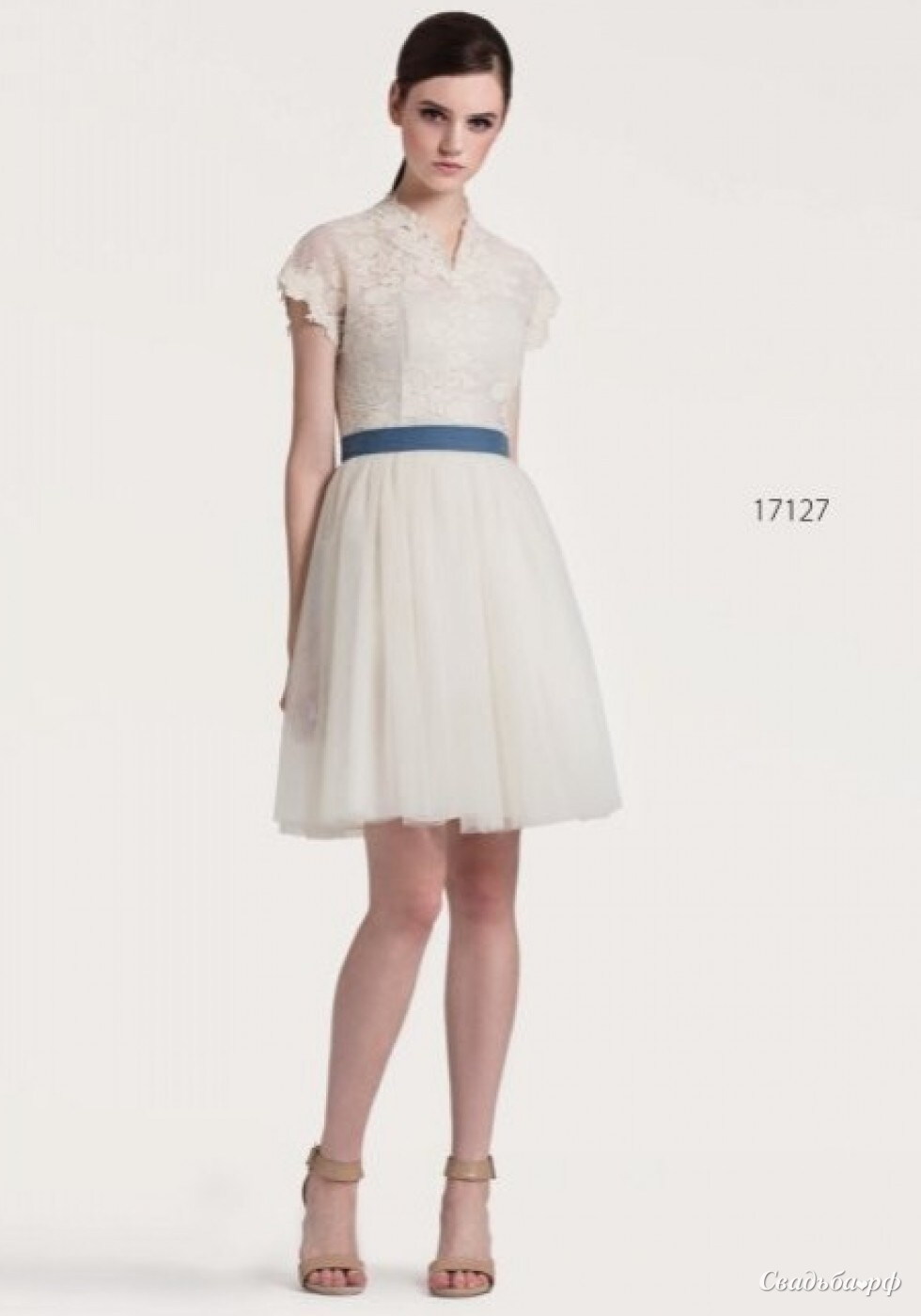 Короткое свадебное платье с фатиновой юбкой и кружевным верхом с небольшим рукавчиком