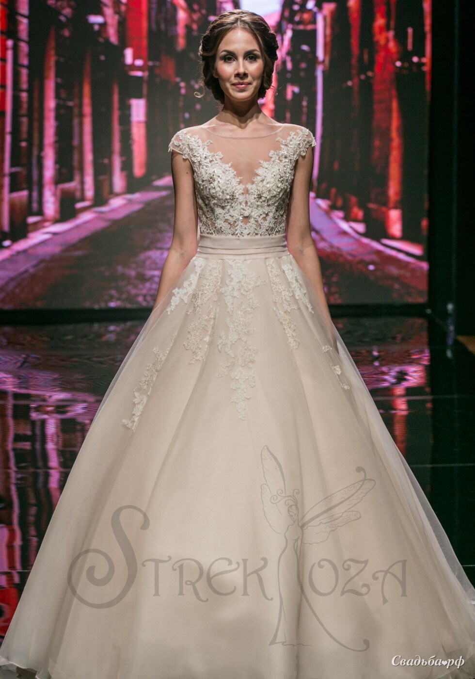 Свадебное платье А-силуэта с длинным шлейфом и красивой прозрачной спиной.