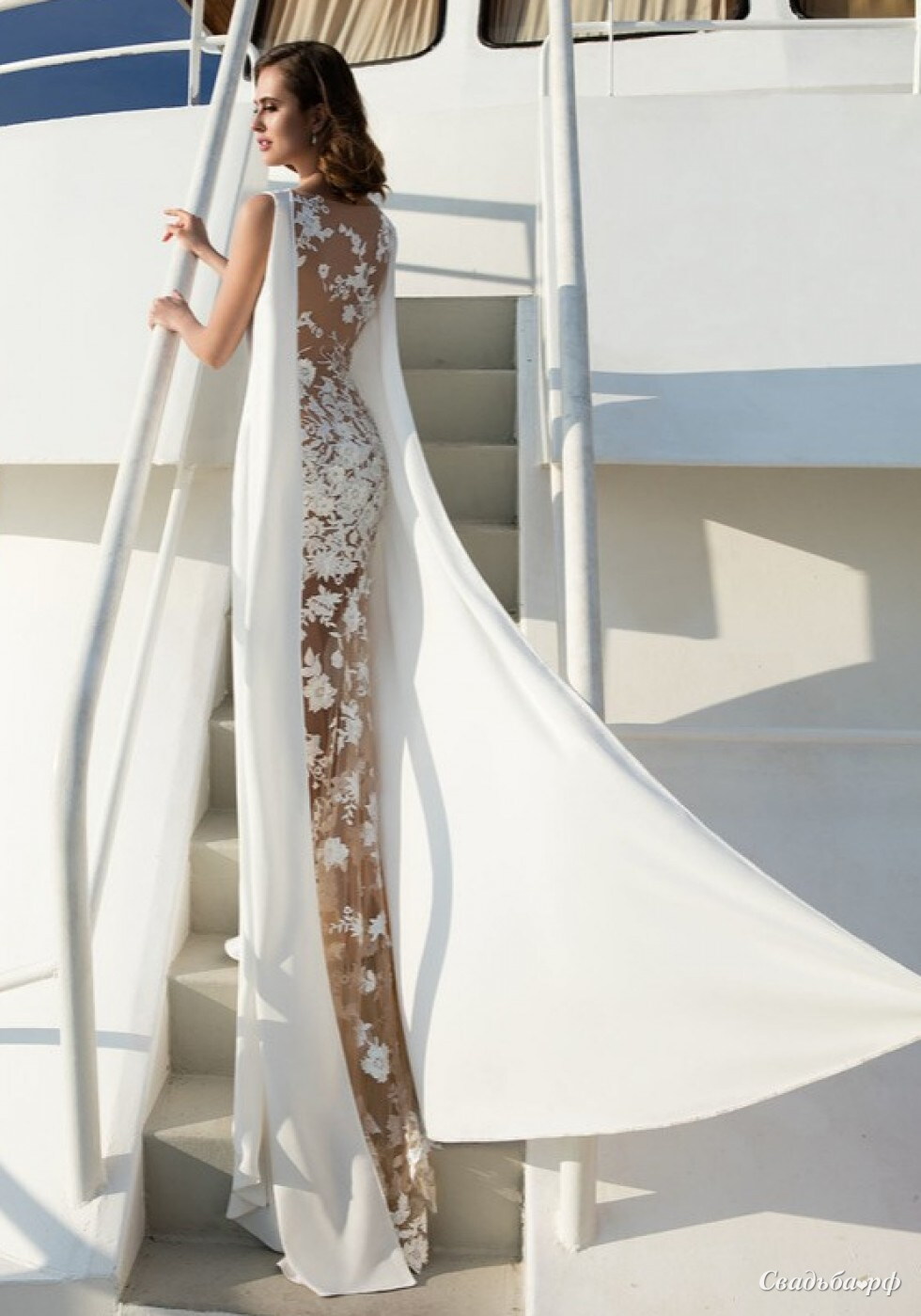 Свадебное платье прямого силуэта, спереди атласное, а со спины кружевное. Нетрадиционное свадебное платье для современных и смелых невест!