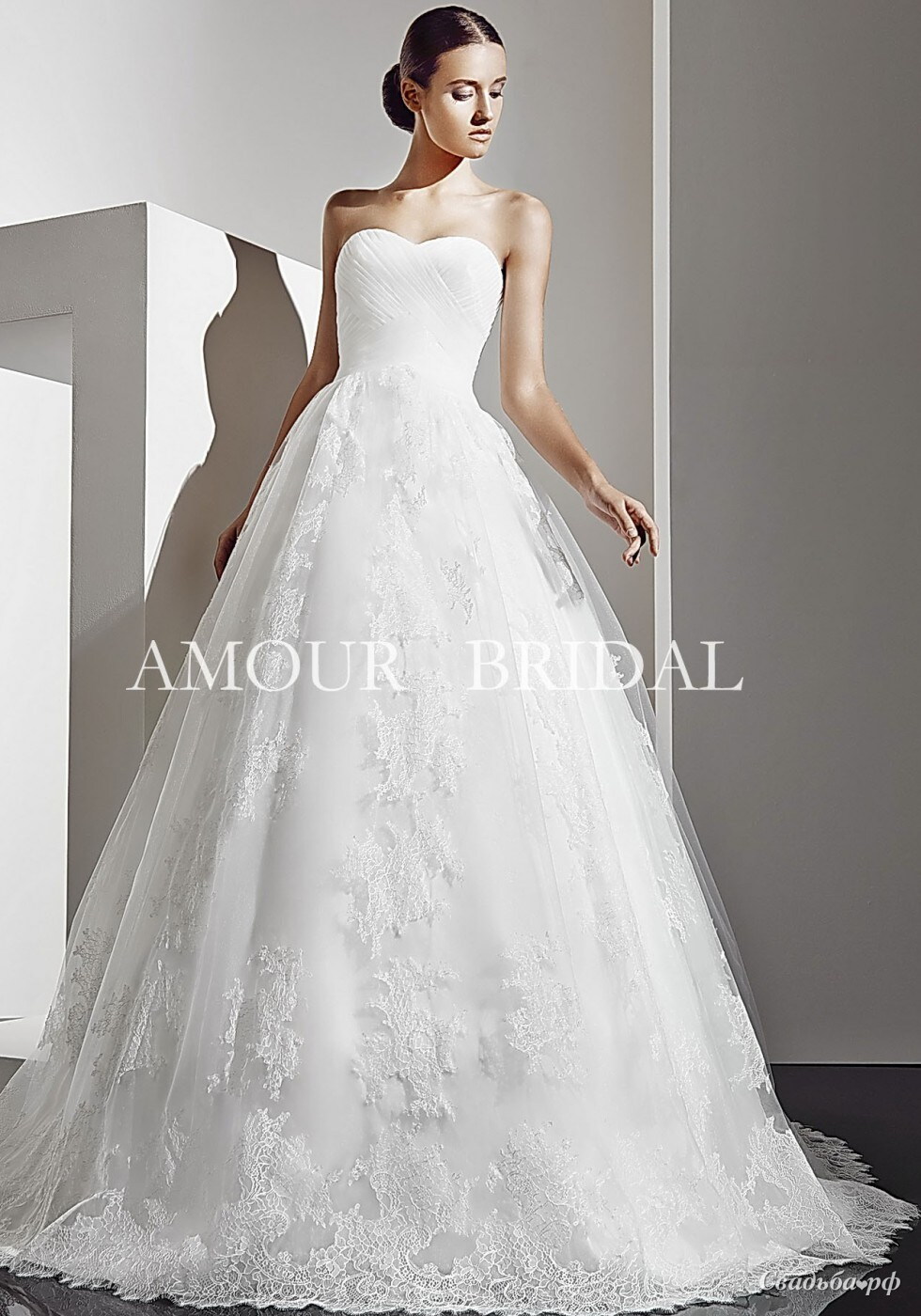 Это очень нежное и женственное свадебное платье с открытым драпированным корсетом и юбкой из кружева шантильи.
