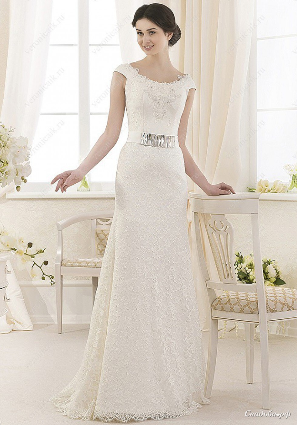 Великолепное силуэтное свадебное платье. Очень красиво садится по фигуре. Из плотного кружева, которое отлично держит форму. U-образный вырез спереди. Широкие бретели на плечиках. Съемный, расшитый кристаллами пояс.