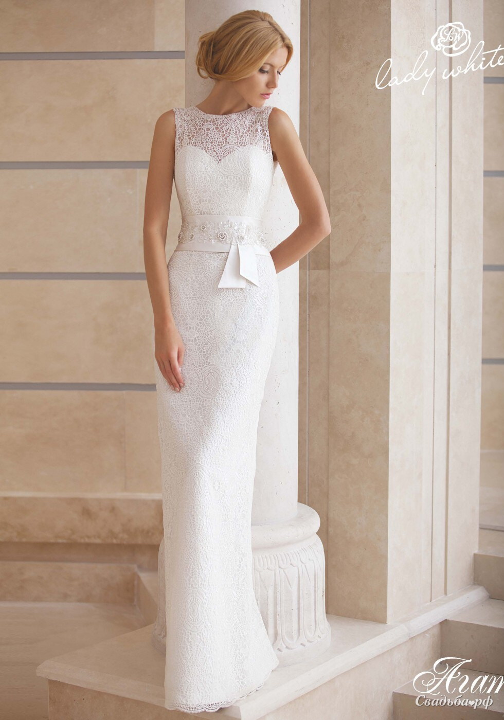 Прямое платье в пол, атласный футляр, покрытый макраме. Широкий гипюровый пояс, расшит стразами Сваровски.