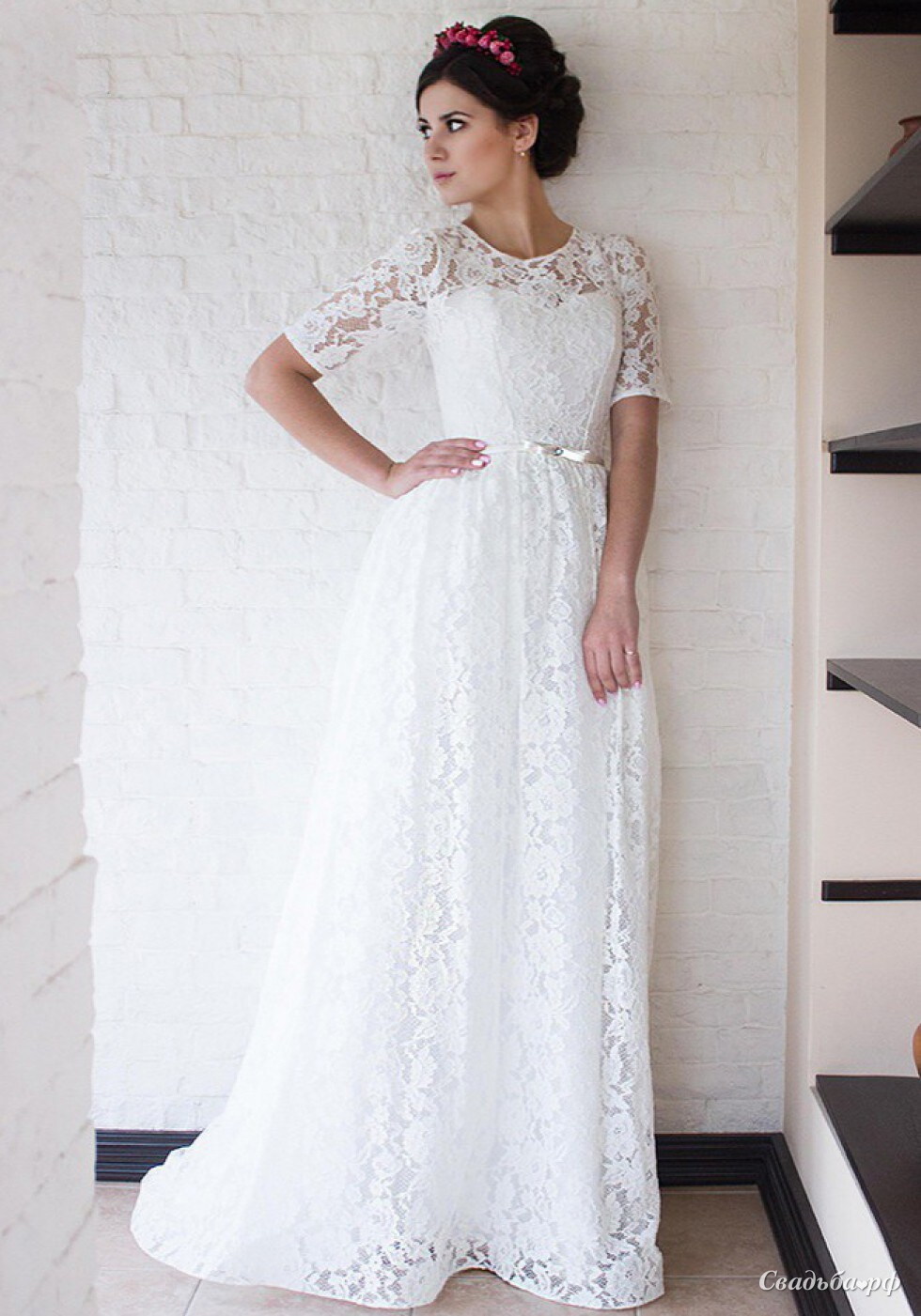 Очень женственное платье для романтичной невесты. Шикарная модель из кружева. Рукав 3/4. Кокетливые пуговички по спинке. Великолепный вариант для зимней невесты!