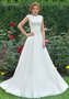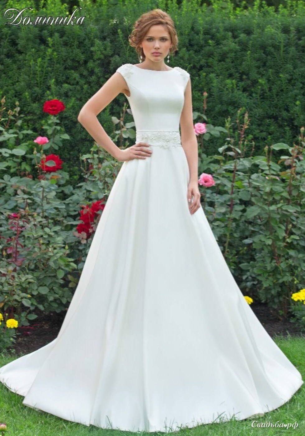 Сдержанное атласное платье А-силуэта. Приталено под пояс. Плечики декорированы гипюром со стразами Сваровски.