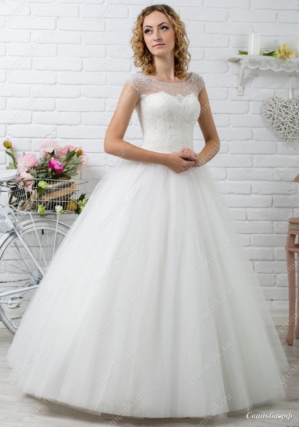 Классический силуэт "Принцесса" с пышной фатиновой юбкой и плотным корсетом, обтянутым маечкой из нежной сеточки с жемчужной вышивкой.