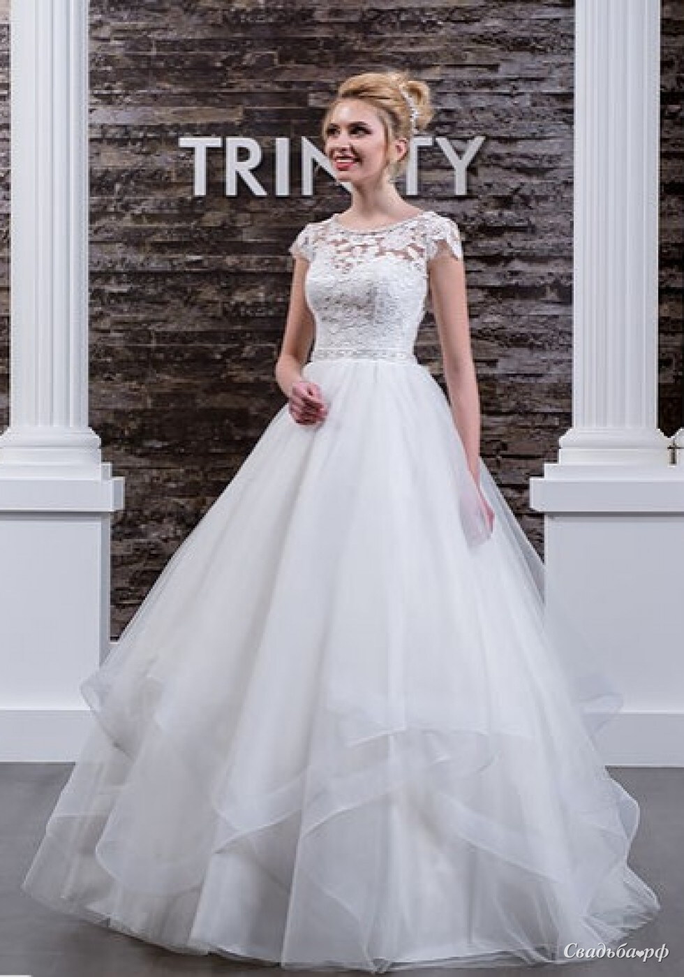 Невероятно нежное и воздушное свадебное платье. Кружевной верх с коротким рукавчиком, закрывающим плечико невесты. Пышная юбка с регилином по краю. Для самых романтичных натур!