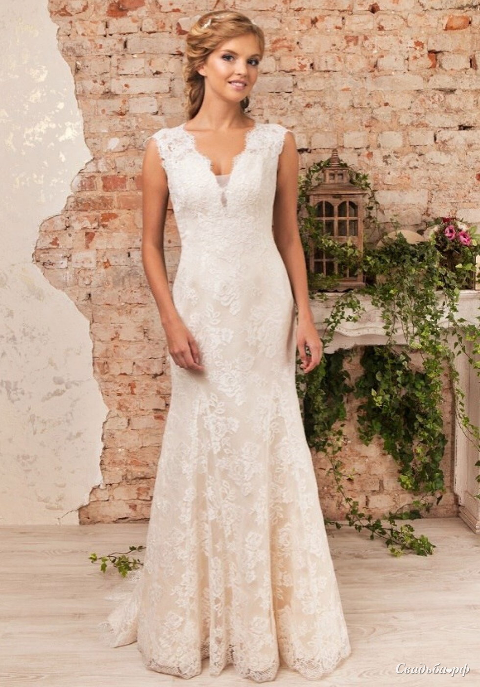 Великолепное свадебное платье силуэта "Рыбка" из нежного белоснежного кружева. Закрытый верх для тех, кто хочет прикрыть плечики или для церемонии венчания. Спинка из эластичной сеточки и кружева на пуговичках. Очень элегантное и женственное свадебное платье без декора. Сзади небольшой шлейф. Идеально сидит на фигуре, подчеркивая её достоинства.