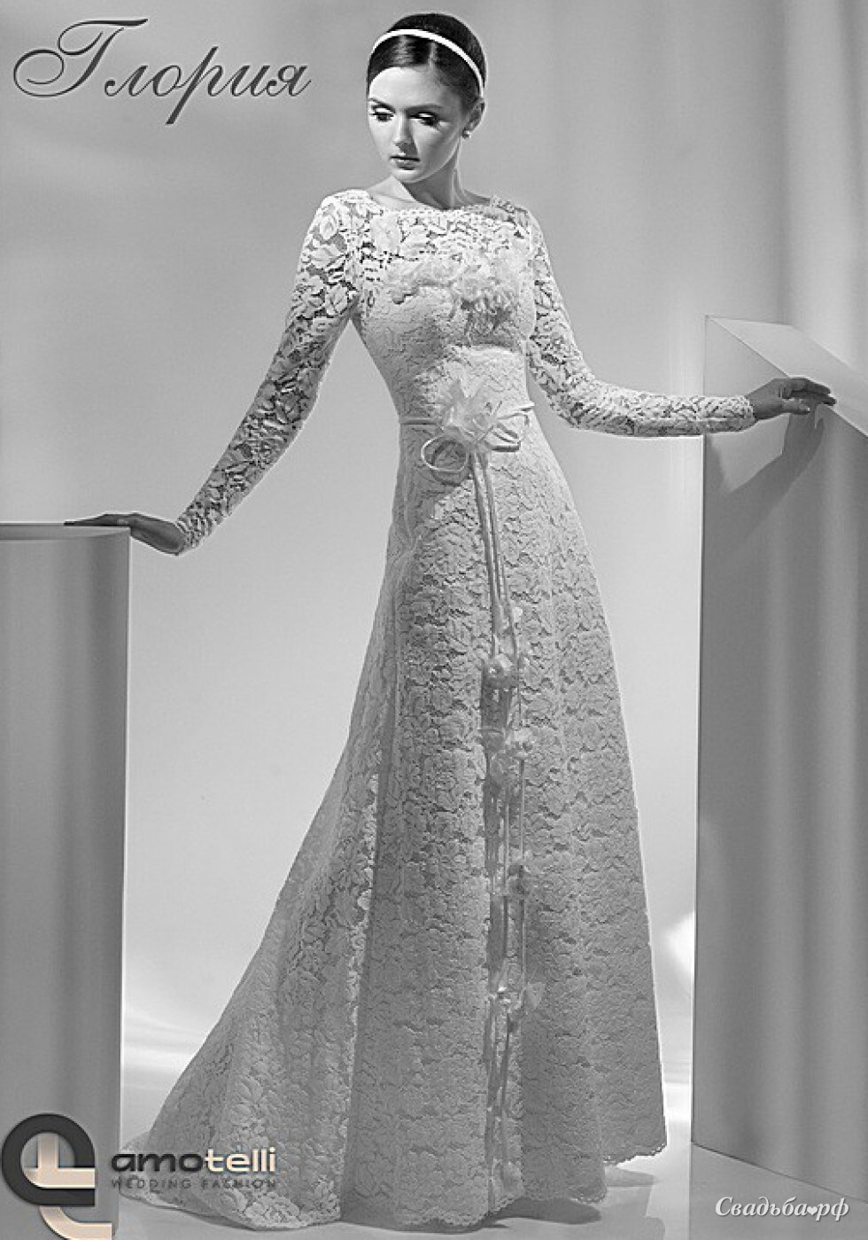 Очень легкое и женственное кружевное свадебное платье с длинными рукавами. Идеально подчеркивает фигуру.