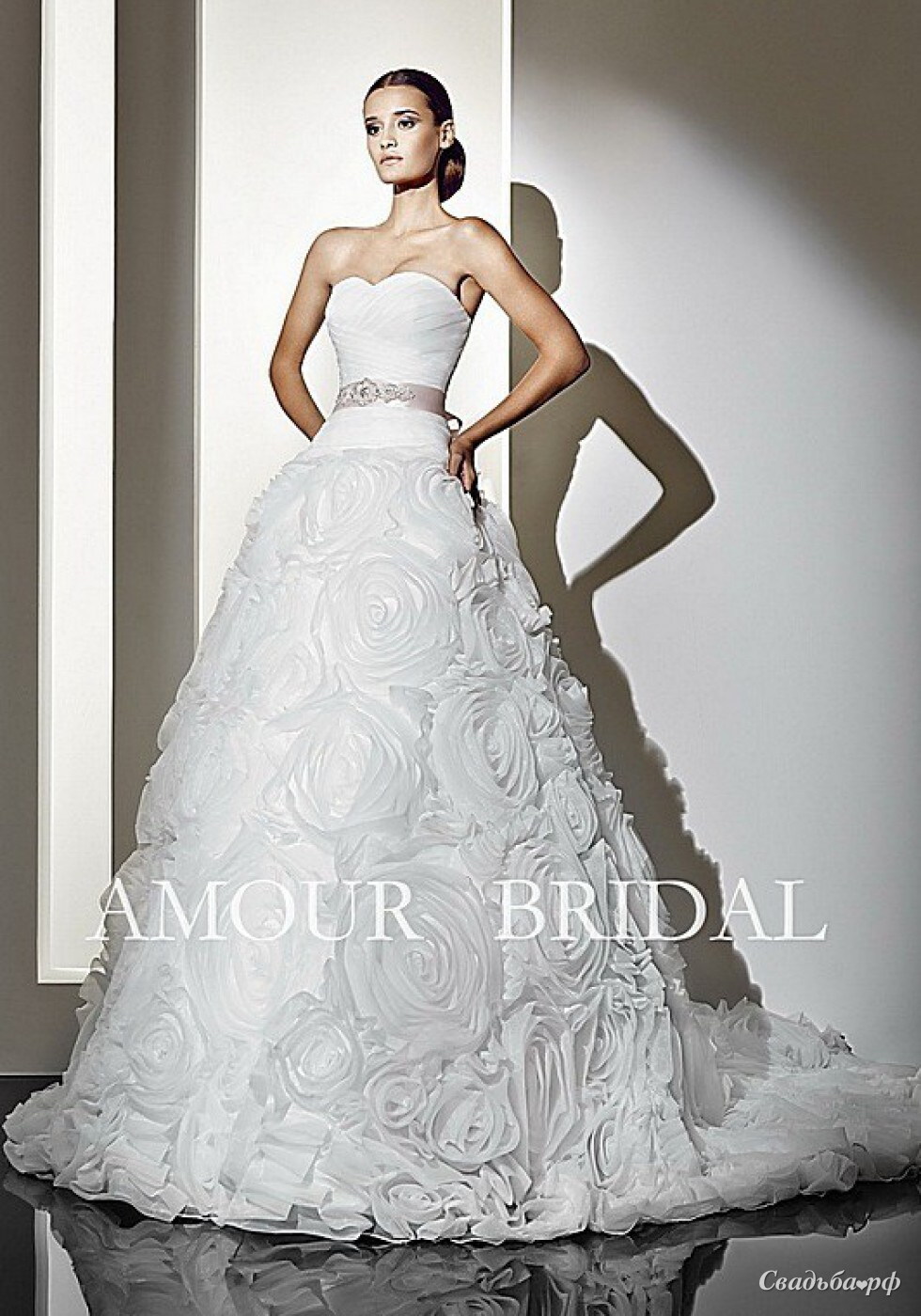 Эффектное свадебное платье с роскошным шлейфом. Съемный пояс.