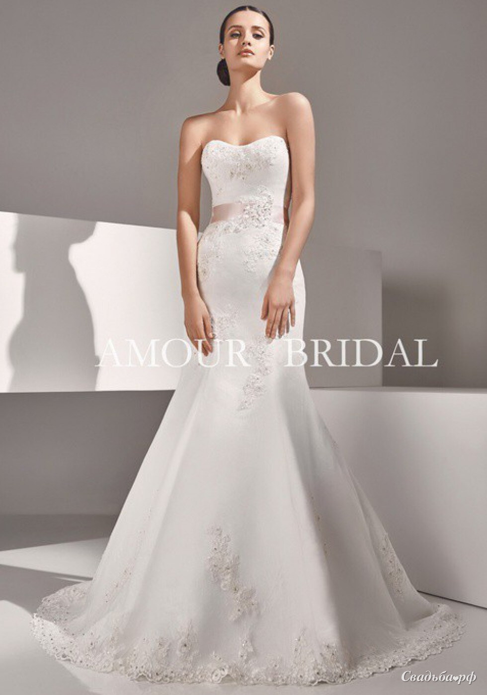 Очень нежное свадебное платье прямого силуэта с небольшим шлейфом. Идеально подчеркивает фигуру.