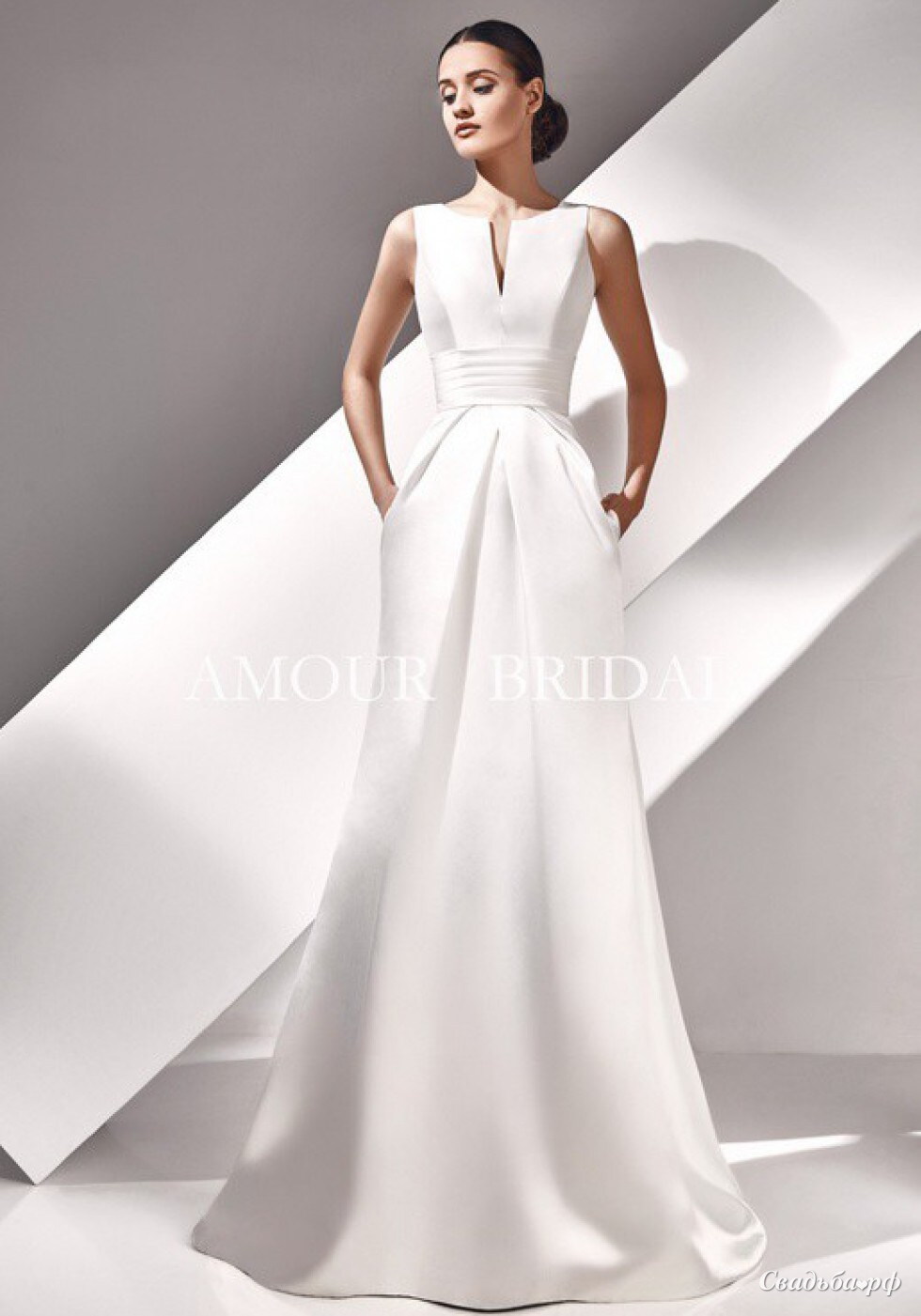 Элегантное свадебное платье с небольшим шлейфом. Выгодно подчеркивает фигуру.