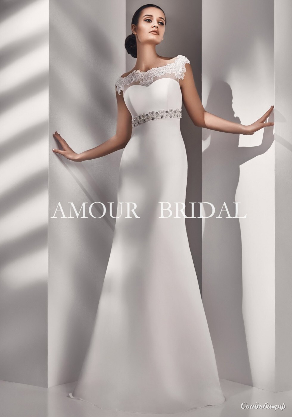 Эффектное свадебное платье с небольшим шлейфом. Выгодно подчеркивает фигуру.