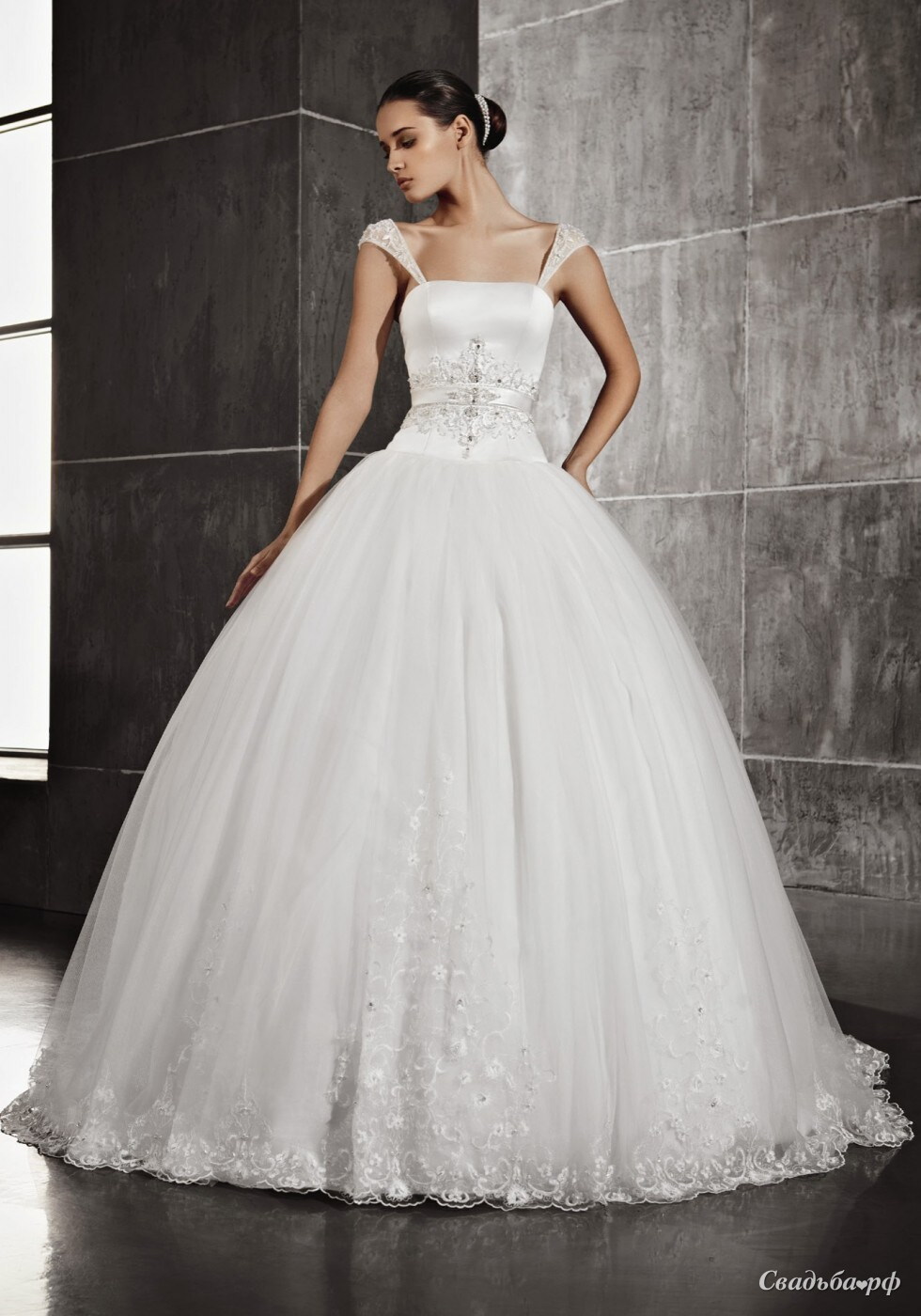 Эффектное свадебное платье с роскошной юбкой из воздушного фатина. Изящные кружевные плечики придают образу дополнительное очарование. Платье выгодно подчеркивает фигуру.