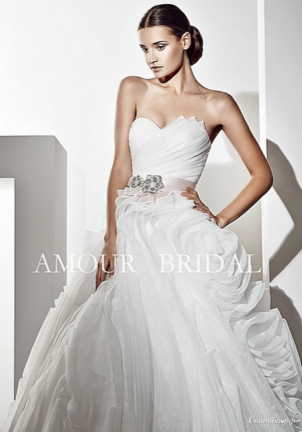 Оригинальное и эффектное свадебное платье с небольшим шлейфом. Выгодно подчеркивает фигуру. Пояс съемный.