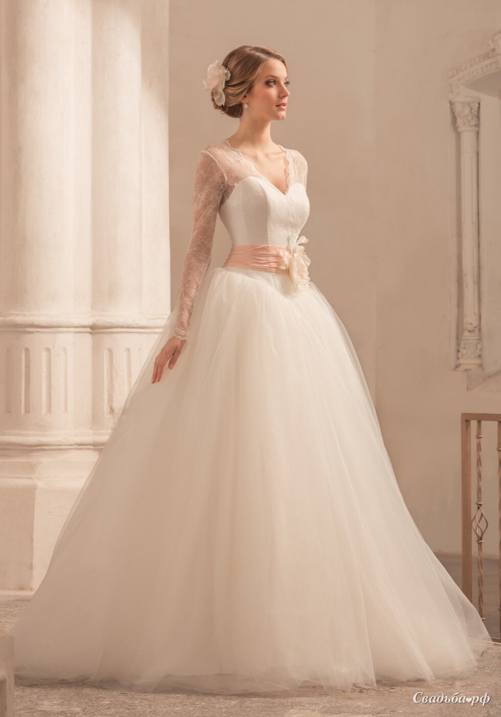 Свадебное платье с эффектной пышной юбкой и небольшим шлейфом. Корсет украшен кружевом Шантильи. Изюминка - шелковые цветы, украшающие пояс.