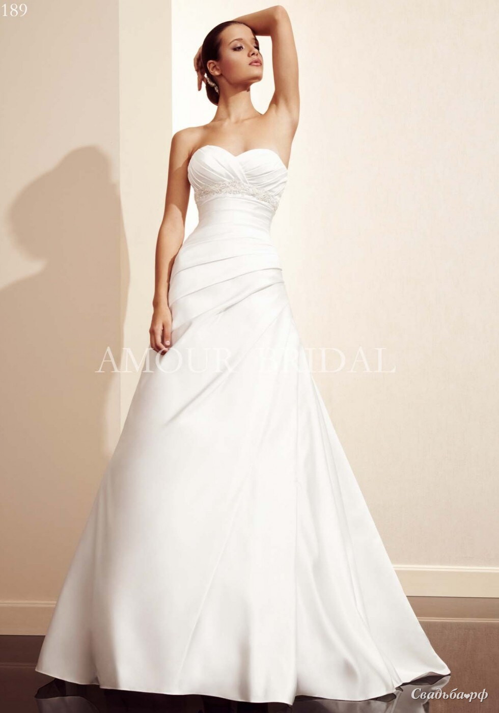 Элегантное свадебное платье из эффектного атласа с небольшим шлейфом. Корсет украшен изящной вышивкой. Платье не имеет никакого лишнего блеска и выгодно подчеркивает фигуру.