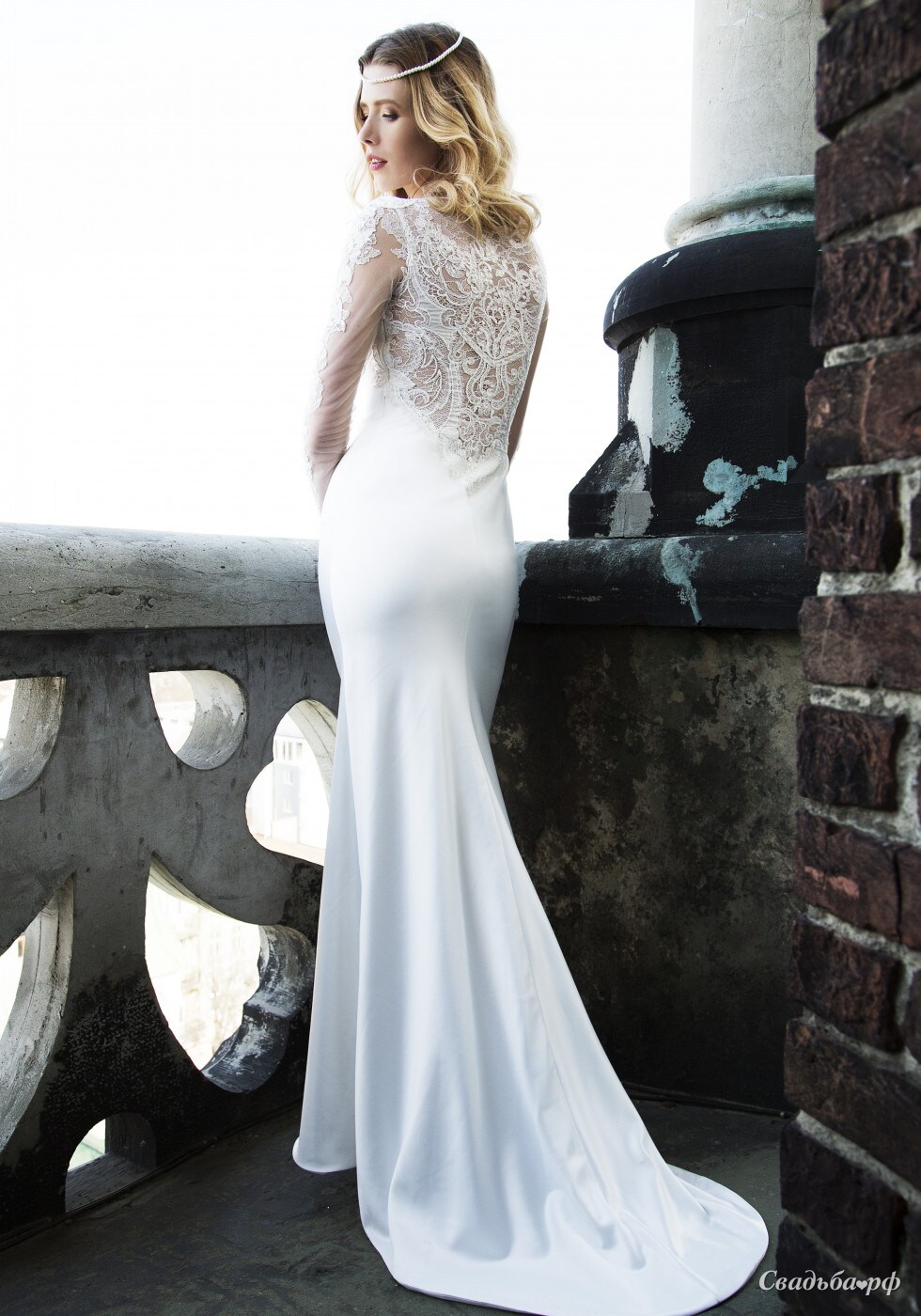 Элегантное свадебное платье с юбкой прямого силуэта и удобным шлейфом. Спина и рукава эффектно украшены изысканным кружевом, умеренно расшитым бусинами. Прекрасный выбор для свадьбы в лаконичном европейском стиле.