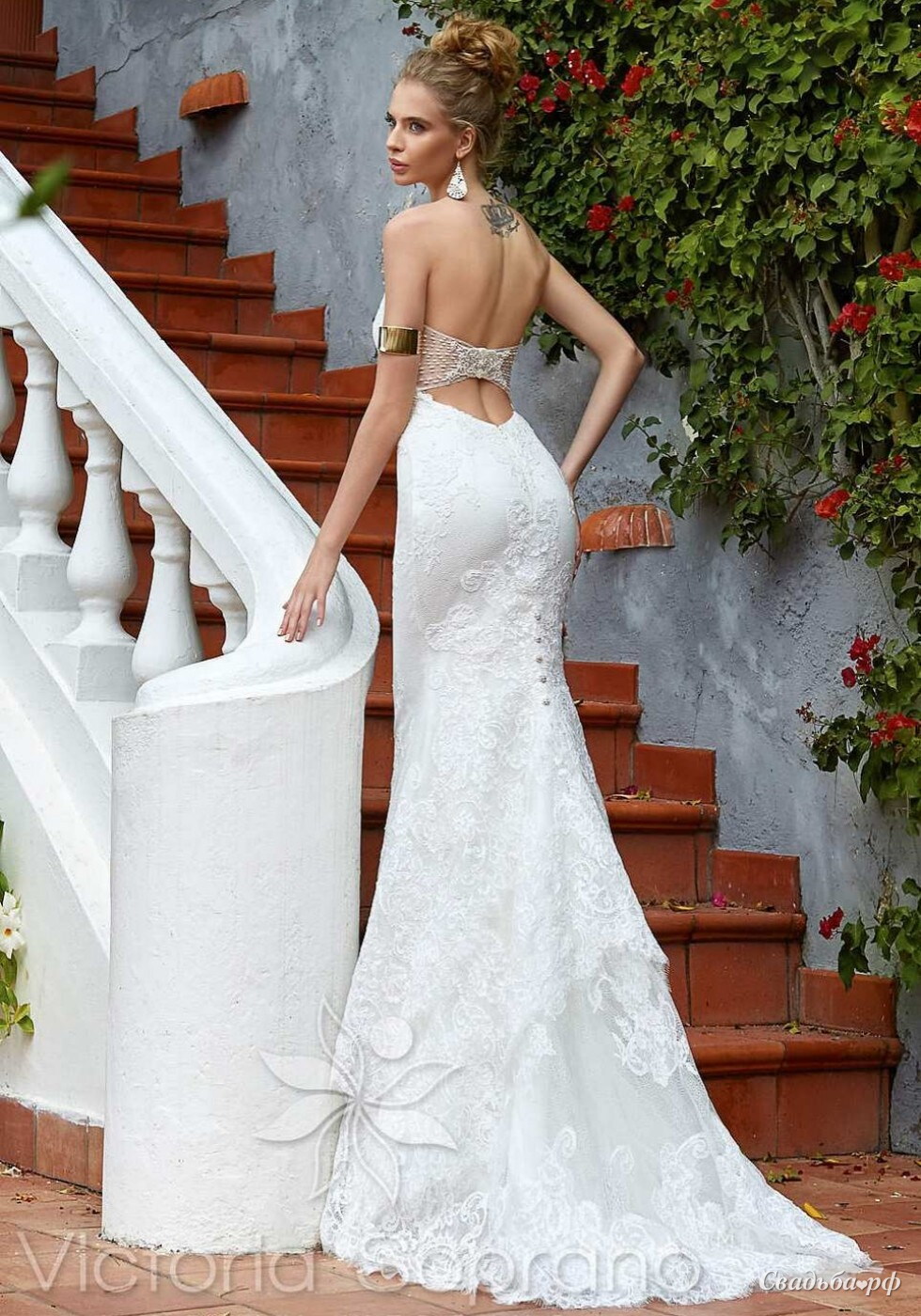 Свадебное платье силуэта "русалка" с эффектно открытой и украшенной спиной. Выгодно подчеркивает фигуру.