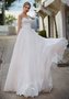 Романтичное свадебное платье А-силуэта с изящно украшенным кружевным корсетом и эффектной юбкой с небольшим шлейфом.