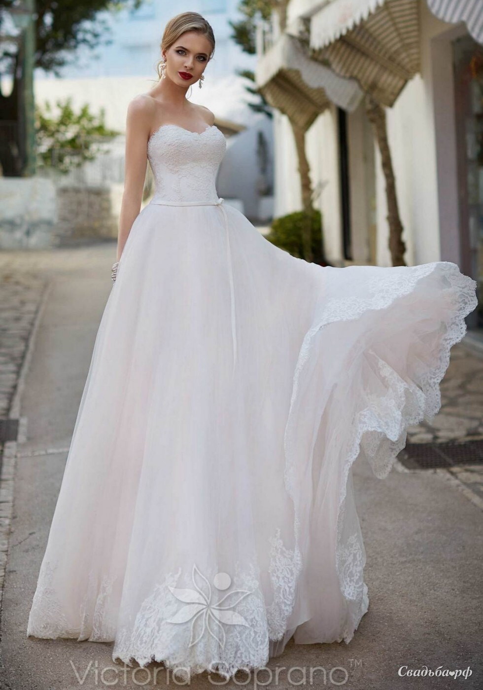 Романтичное свадебное платье А-силуэта с изящно украшенным кружевным корсетом и эффектной юбкой с небольшим шлейфом.