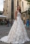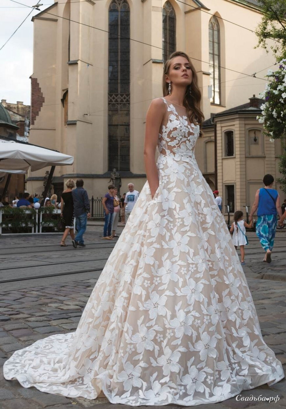 Эффектное свадебное платье с оригинальным цветочным принтом. Создает яркий и запоминающийся образ.