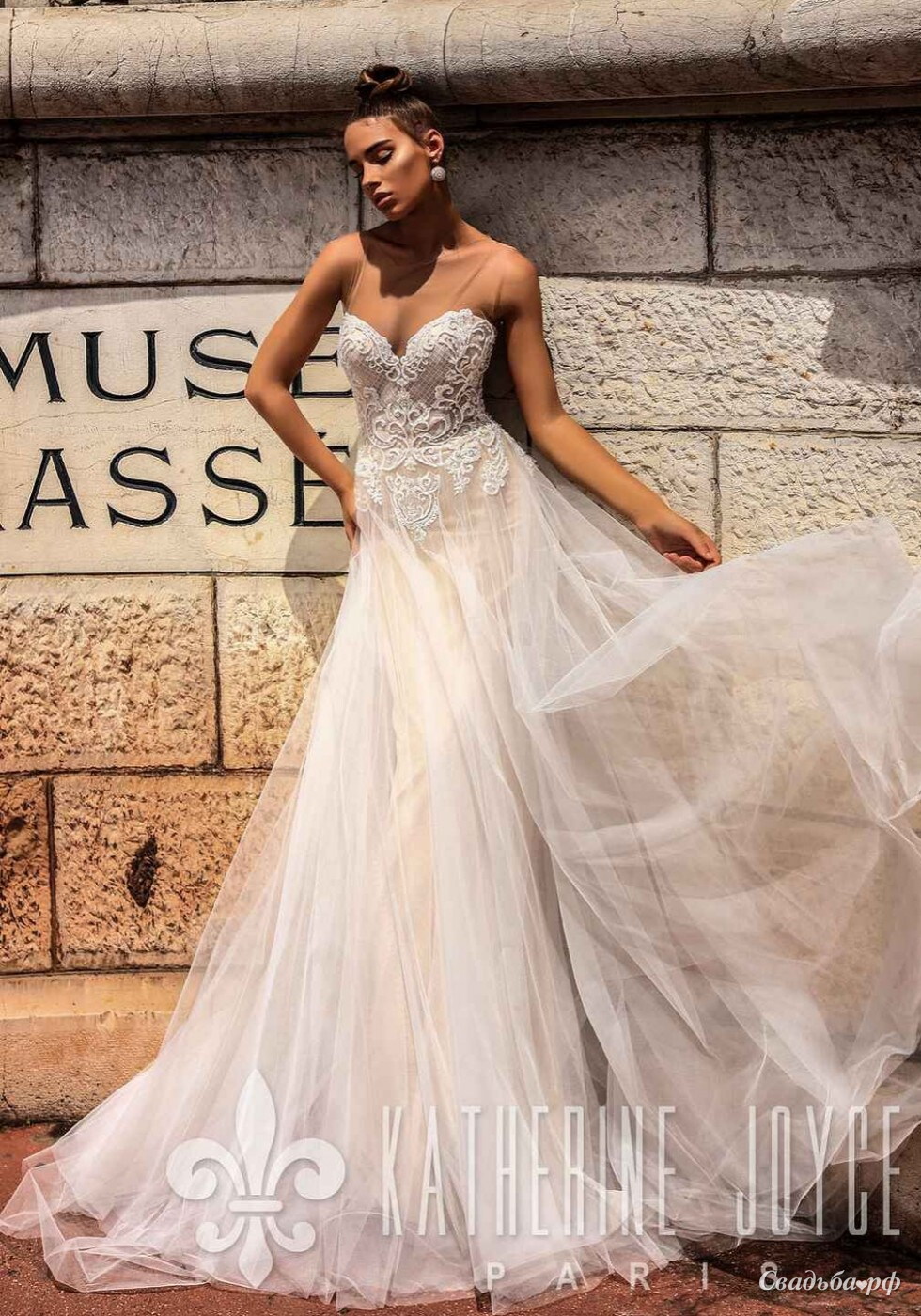 Свадебное платье с умеренно пышной юбкой и удобным шлейфом.