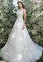 Свадебное платье предназначено для самой взыскательной модницы. Мерцающее кружево покрывает тончайшие линии корсета с контрастными переливами цвета. Струящаяся юбка выполнена из каскадов летящей органзы.