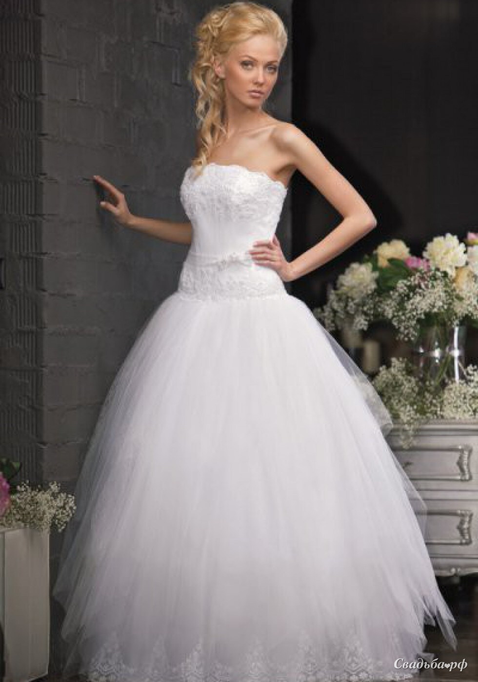 Шикарное платье для нежной невесты. Утонченный корсет отлично подчеркивает силуэт фигуры. Пышная юбка-пачка очаровывает своей легкостью. Оригинальная юбка порадует креативными элементами.