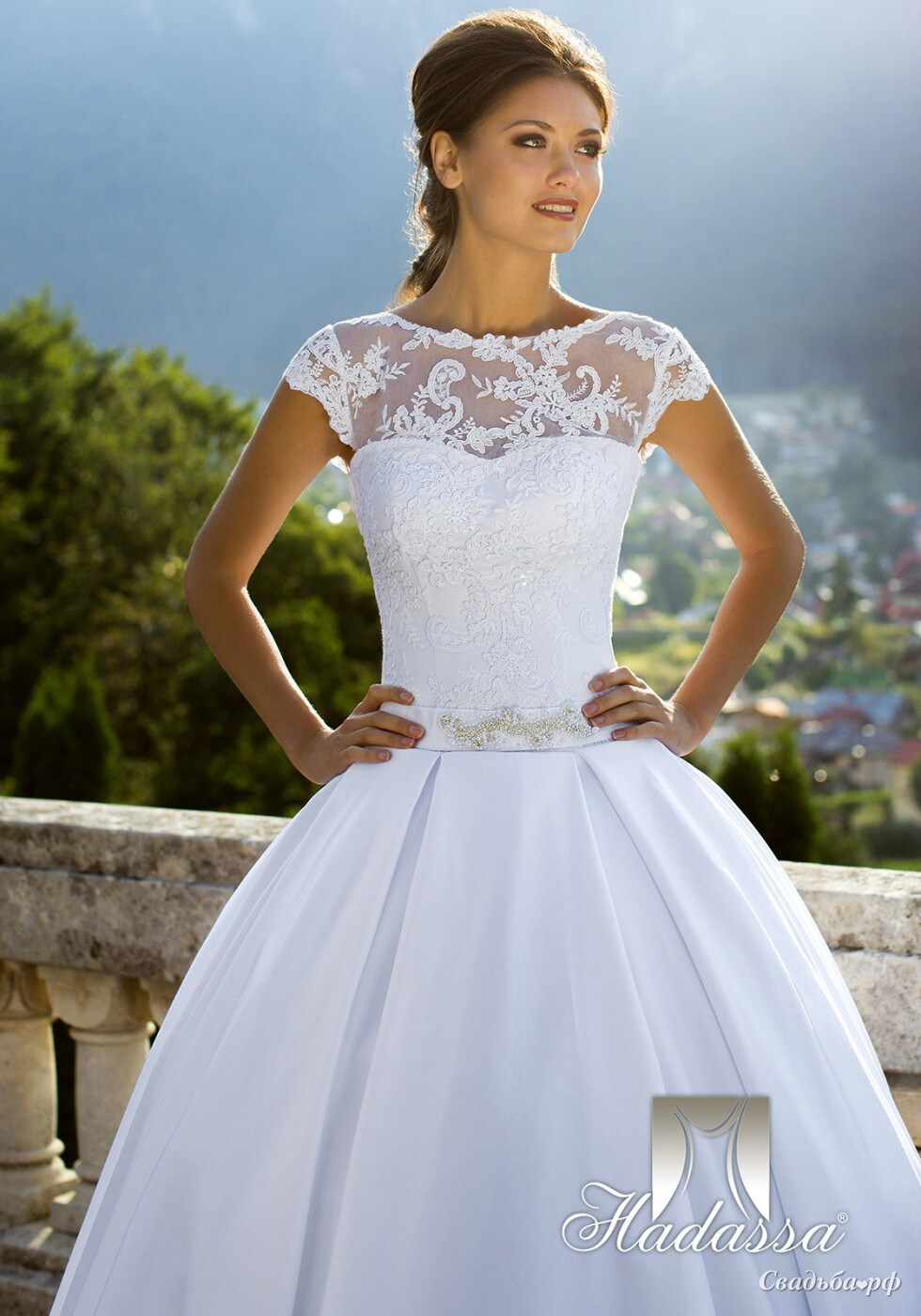 Королевское платье, выполненное в английском стиле. Подойдет для утонченной леди. Очаровательное ажурное кружево подчеркнет Ваши хрупкие плечи. Благородную атласную юбку украшают рантовые складки.