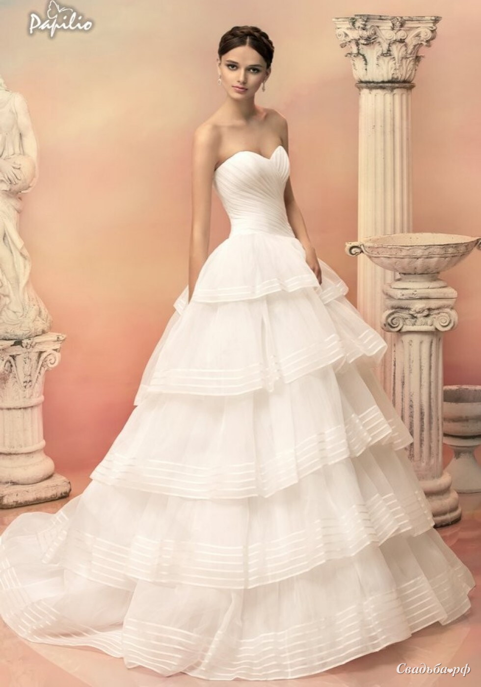 Пышное декольтированное платье с изящно задрапированным корсетом и объемной юбкой с ярусными воланами, с тонко настроченными полосками из органзы. Модель предлагается в белом или кремовом цветах.