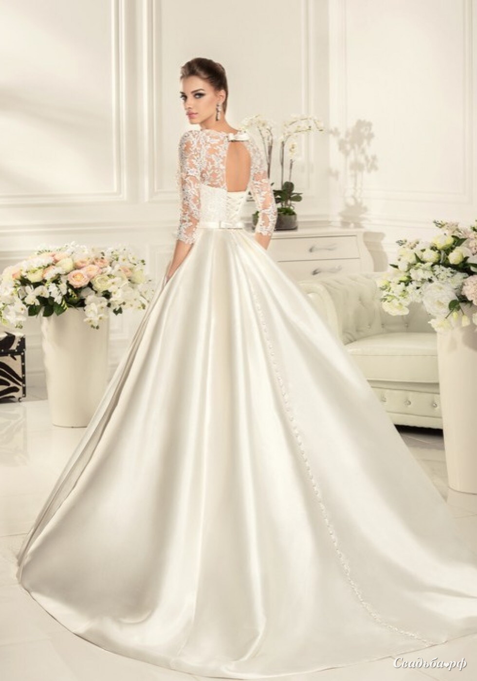 Атласное свадебное платье с кружевным корсетом и открытой спинкой. Пуговки расположены по всей длине юбки. Очень стильное свадебное платье.