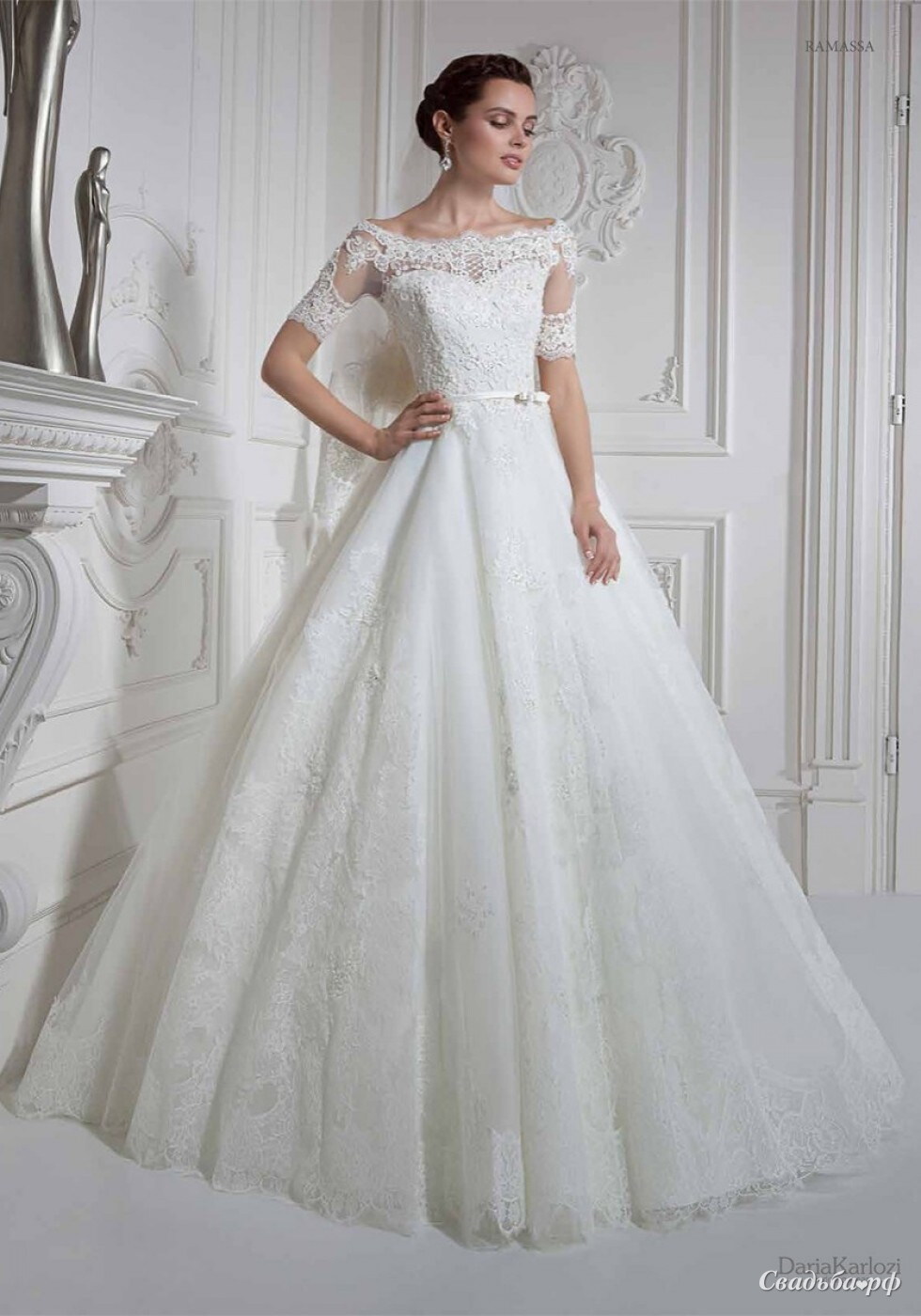 Стильное кружевное свадебное платье А-силуэта идеально подойдет для зимней свадьбы.