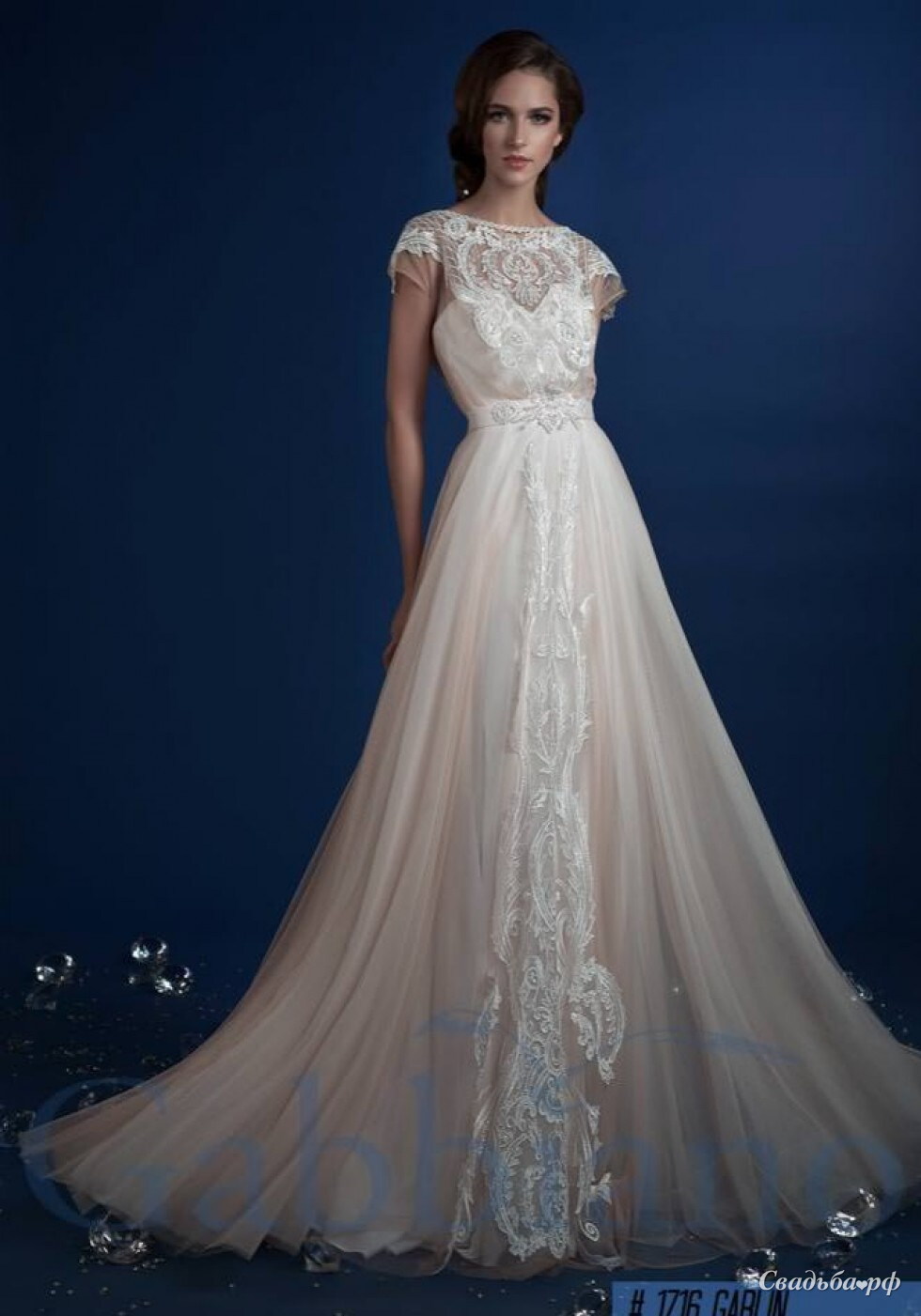 Стильное свадебное платье в стиле Boho от известного мирового бренда Gabbiano новой коллекции Brilliant из мягкого фатина и расшитого кружева. Идеально подойдет для венчания в церкви и для девушек в интересном положении.