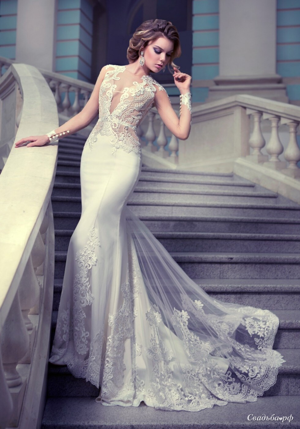 Стильное свадебное платье по фигуре из нежного кружева идеально подойдет для обладательниц красивых форм.