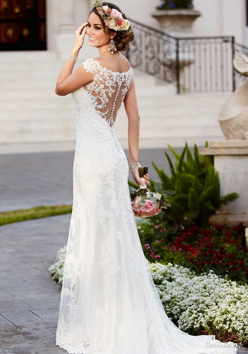 Стильное свадебное платье с прямой юбкой и красивой кружевной спинкой.