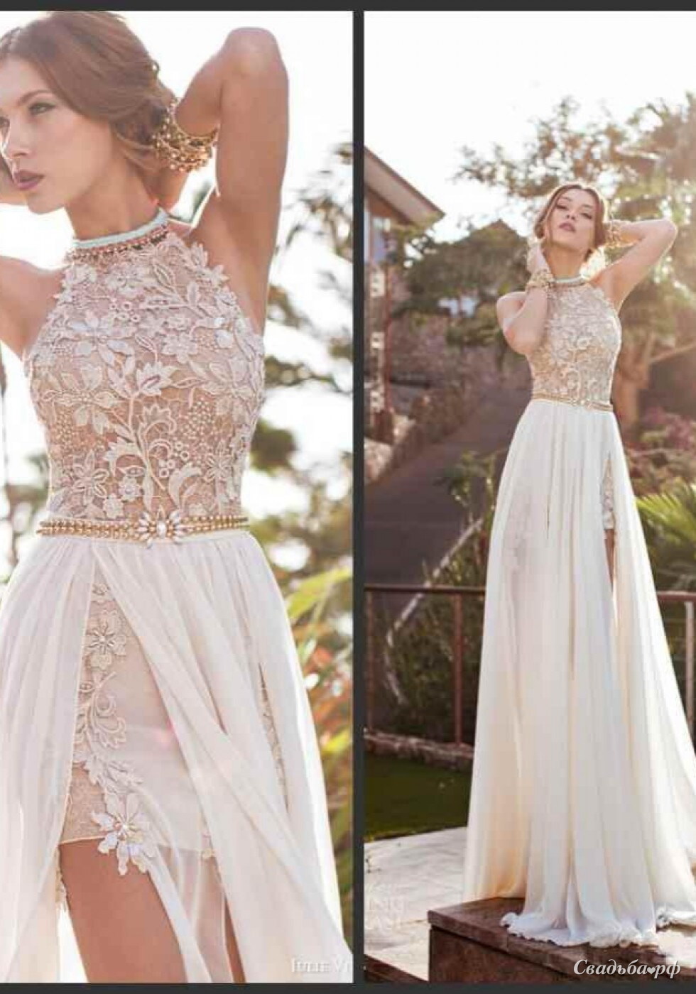 Стильное свадебное платье из шифона украсит хрупкую девушку. Кокетливый разрез по ножке придаст образу шарма. Такое свадебное платье идеально подойдет, как для летних городских, так и для свадеб на море!