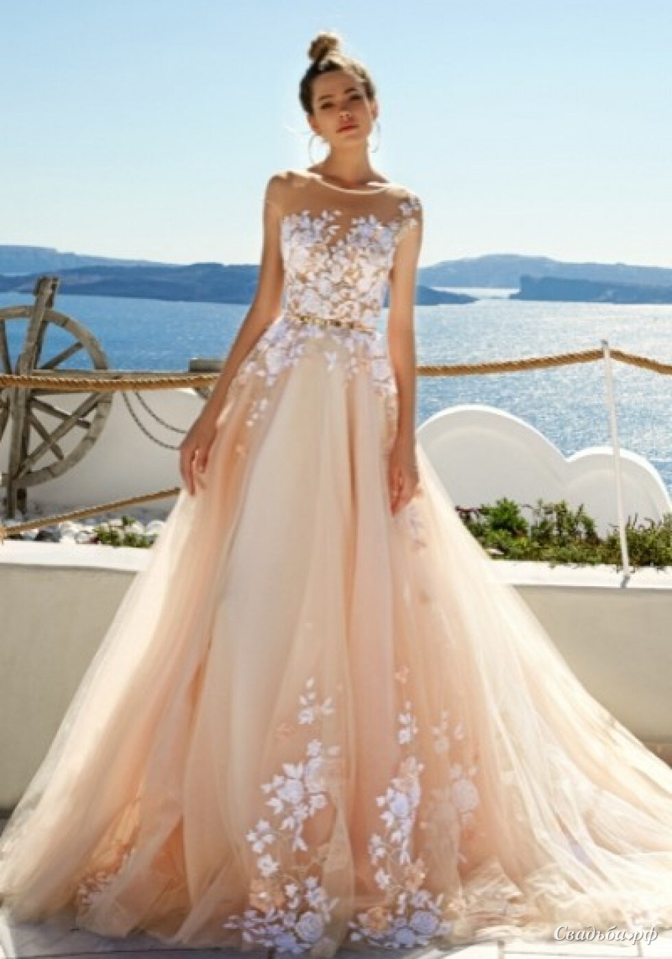 Стильное свадебное платье в цвете пудра с легкой юбкой из фатина.