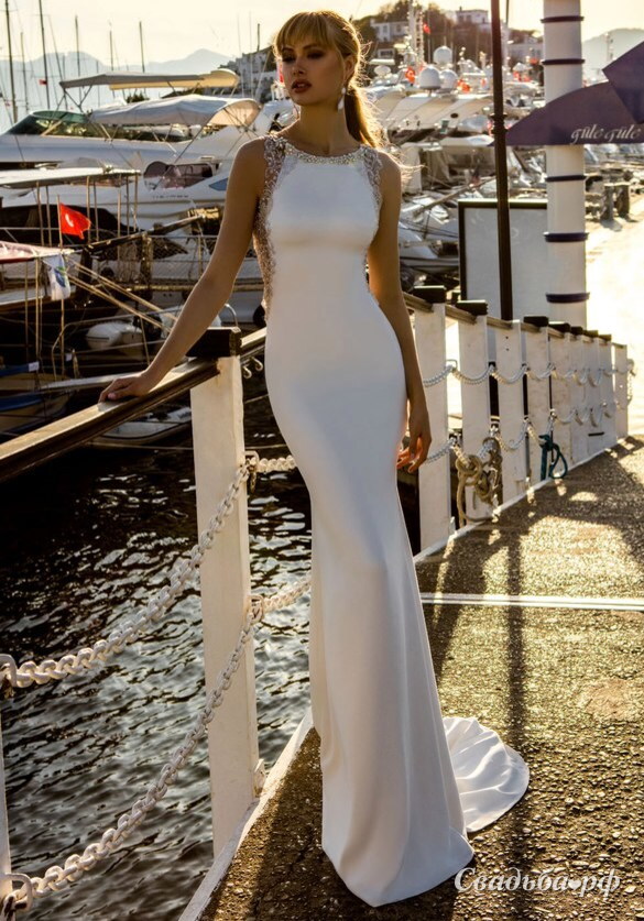 Невероятно стильное свадебное платье по фигуре. Спинка платья украшена ручной вышивкой из страз.