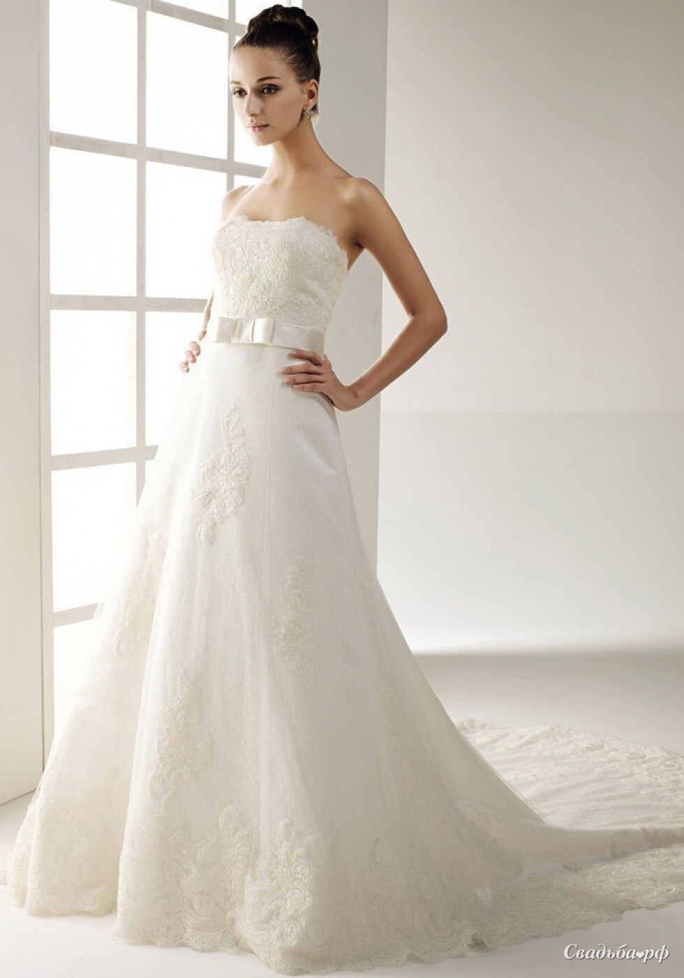 В этом платье из атласа и фатина, расшитого кордовым кружевом вы будете очаровательно нежны и романтичны.