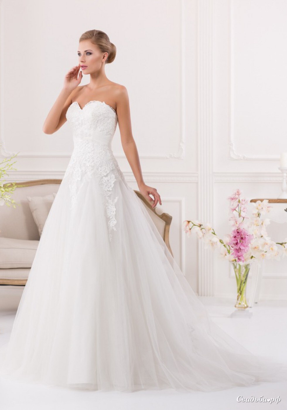 Это дивное свадебное платье словно соткано из воздушных белоснежных облаков. Пышная юбка из нежнейшего фатина в сочетании легкими кружевными орнаментами создают незабываемый образ традиционного свадебного наряда от модельеров марки X’ZOTIC. Платье-бюстье с кружевным лифом в форме сердечка, по спинке украшенное шнуровкой – отличный образец сдержанного стиля. Необыкновенный легкий шлейф чудесно гармонирует с общим видом этого свадебного платья.