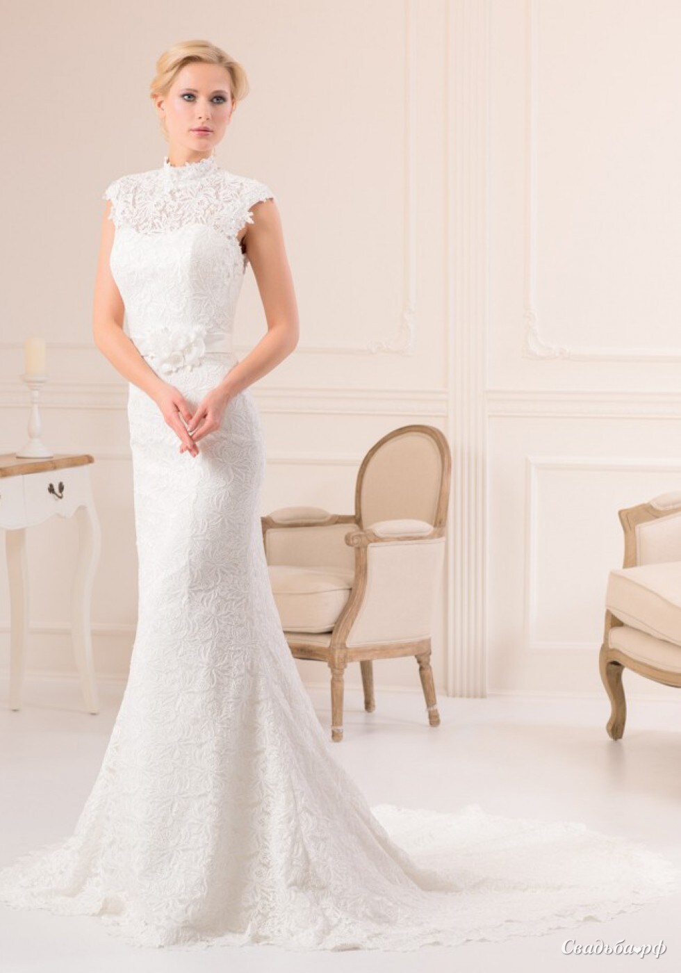 Элегантное кружевное платье из кордового кружева. Закрытый верх с воротничком-стоечкой выглядит очень элегантно и изысканно. Линия талии эффектно выделена широким поясом, украшенным объёмной цветочной композицией из ткани. Роскошная юбка силуэта русалочка струится вдоль фигуры и плавно переходит в великолепный романтичный шлейф.