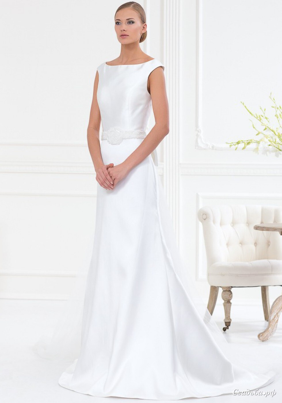 Cвадебное платье прямого силуэта создает изысканный образ с легким намеком на винтажный стиль. Такой эффект обеспечивает классический для середины двадцатого века вырез лодочкой и плотный глянцевый атлас, из которого создано платье. Широкие бретели слегка спускаются на плечи, подчеркивая их форму, а талию помогает выделить атласный пояс с мерцающей отделкой, плотным слоем покрывающей его по всей длине.