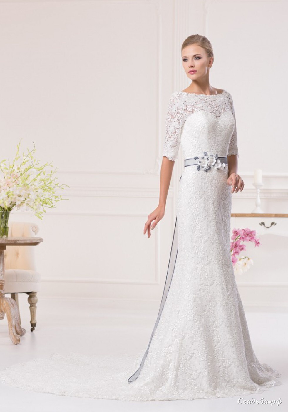 Точеная изысканная модель свадебного платья силуэта "русалка". Нежность и красота этого платья поможет невесте, которая в такой торжественный день желает выглядеть великолепно и неотразимо. Благородство дорогого кордового кружева, используемого в основе этого элегантного свадебного платья, создает образ утонченной и разборчивой леди, которая знает себе цену. Красивая модель платья с рукавами из тонкого фатина, расшитого элементами кружева, которое, словно нежные лепестки белой розы, аккуратно переплелись на руках у невесты.