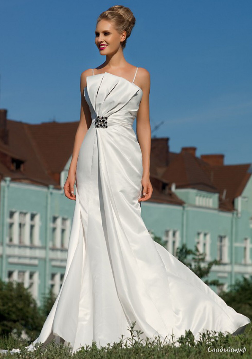 Это великолепное платье из шелкового сатина, со шлейфом, подойдет как для свадьбы, так и для торжественного вечера. В нем прекрасно сочетается необычно выполненная область лифа аккуратно спускающаяся к линии талии прямыми складками, слегка напоминающими бант. Завершает этот необыкновенный элемент изюминка платья - прекрасная брошь прямоугольной формы украшенная сверкающими камнями и кристаллами и повторяющаяся на спине аккуратно придерживая шлейф. Последний размер.