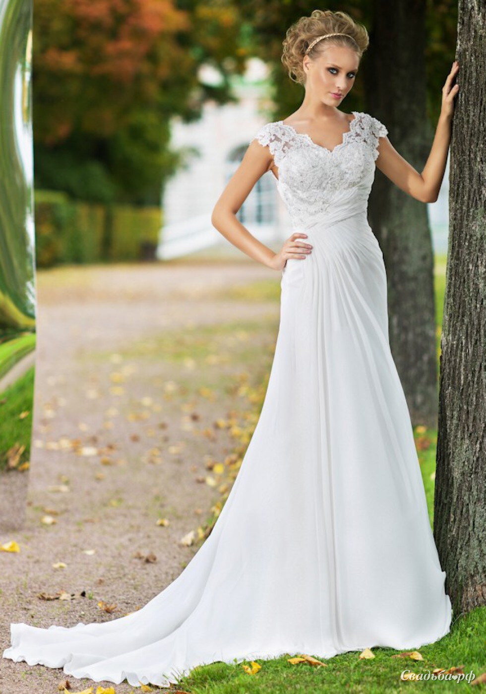 Элегантное длинное свадебное платье прямого покроя с длинным утонченным шлейфом сделает Вашу фигуру предметом зависти в такой прекрасный день, день Вашего бракосочетания. Легкая летящая шифоновая юбка. Расшитая пайетками и полупрозрачным бисером область декольте. Полуобнаженная спинка. Все эти элементы такого свадебного платья не оставят равнодушными ни гостей торжества, ни Вашего суженого.