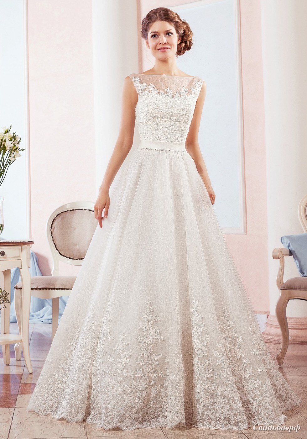 Пышное свадебное платье из фатина, расшитое кружевом, грудь прикрыта прозрачной сеткой-маечкой. Изящные широкие лямки и небольшой бант на спине делают это платье мечтой любой невесты!