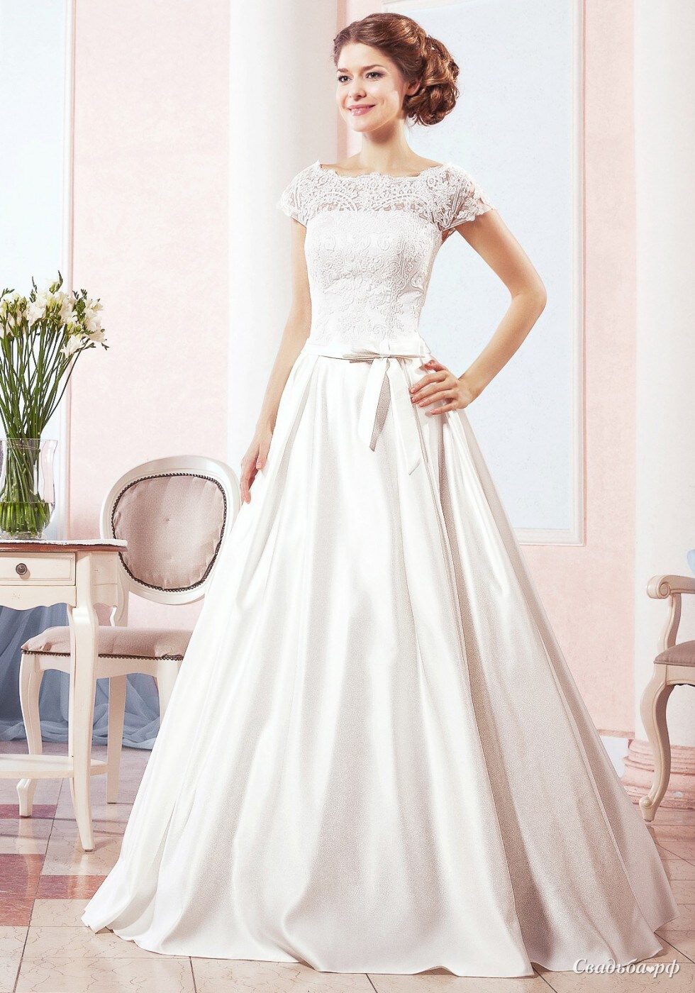 Атласное свадебное платье А-силуэта с рукавчиками-фонариками.
