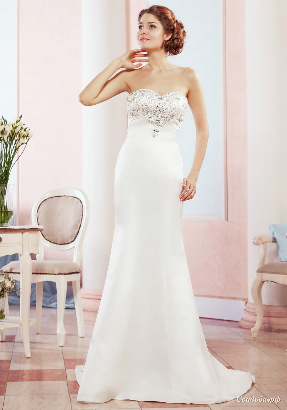 Шикарное атласное платье силуэта русалка в цвете айвори, с изумительной открытой спинкой и расшитым корсетом.